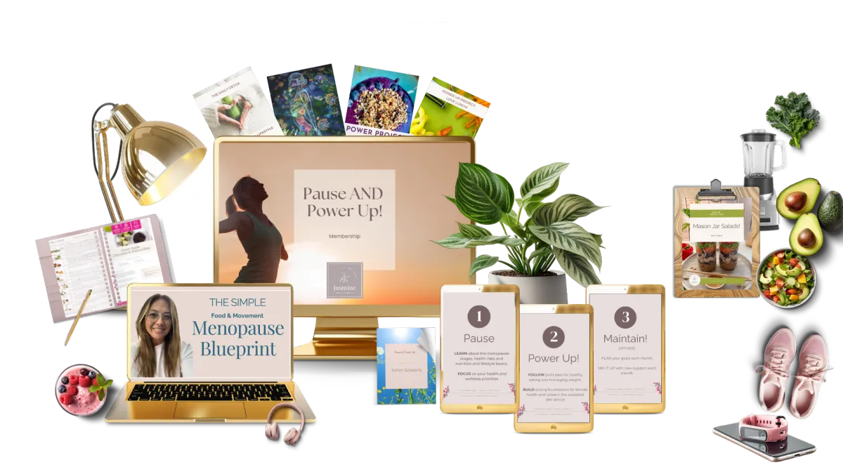 A month to month membership with a yearly payment option where you get access to nutrition lessons, step by step guidance, group and 1-1 support with Jasmine, Nutrition & Lifestyle Coach certified in Menopause Weight Loss and SO much more!